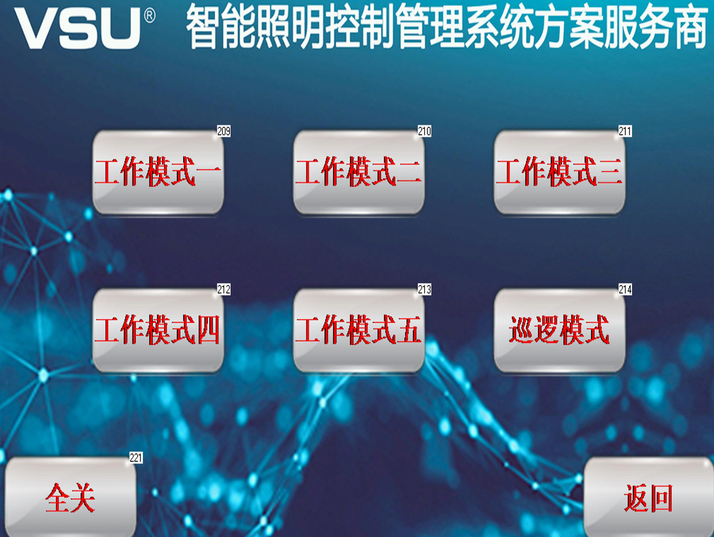 該項目中在智能照明領域采用的是VSU-NET總線型智能照明控制系統(tǒng),8路、12路、16路16A智能照明模塊、6鍵面板、7寸觸摸屏、電源模塊、網(wǎng)關模塊、級聯(lián)模塊等系列設備形成整個智能化照明控制系統(tǒng)。